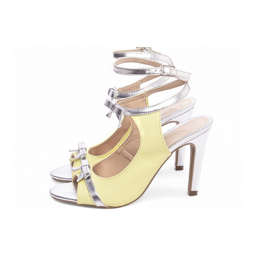 Sandália Feminina Amarela Salto Alto Agulha com Laço Prateado Características: – Material: Napa Amarelo com detalhes em Napa Metalizado Prata – Enfeite: Fivela de ajuste na cor Prata e laço em Napa Metalizado Prata – Palmilha: 8 mm de espessura, espuma em EVA, revestida em Napa Metalizado Prata com taloneira em Napa Bege – Salto: Fino com 9,5 cm de altura, revestido em Napa Metalizado Prata – Solado: PVC com antiderrapante na cor Bege Dicas de Limpeza e Conservação: – Faça a limpeza com pano macio levemente umedecido em sabão neutro, com cuidado especial nas áreas prateadas e no laço para manter o brilho e a delicadeza. – Armazene em local seco, ventilado e longe da luz solar direta; saquinhos de tecido ajudam a conservar a napa e os detalhes metalizados. – Utilize hidratante específico para napa sintética e flanela seca para realçar o brilho da parte metálica.
