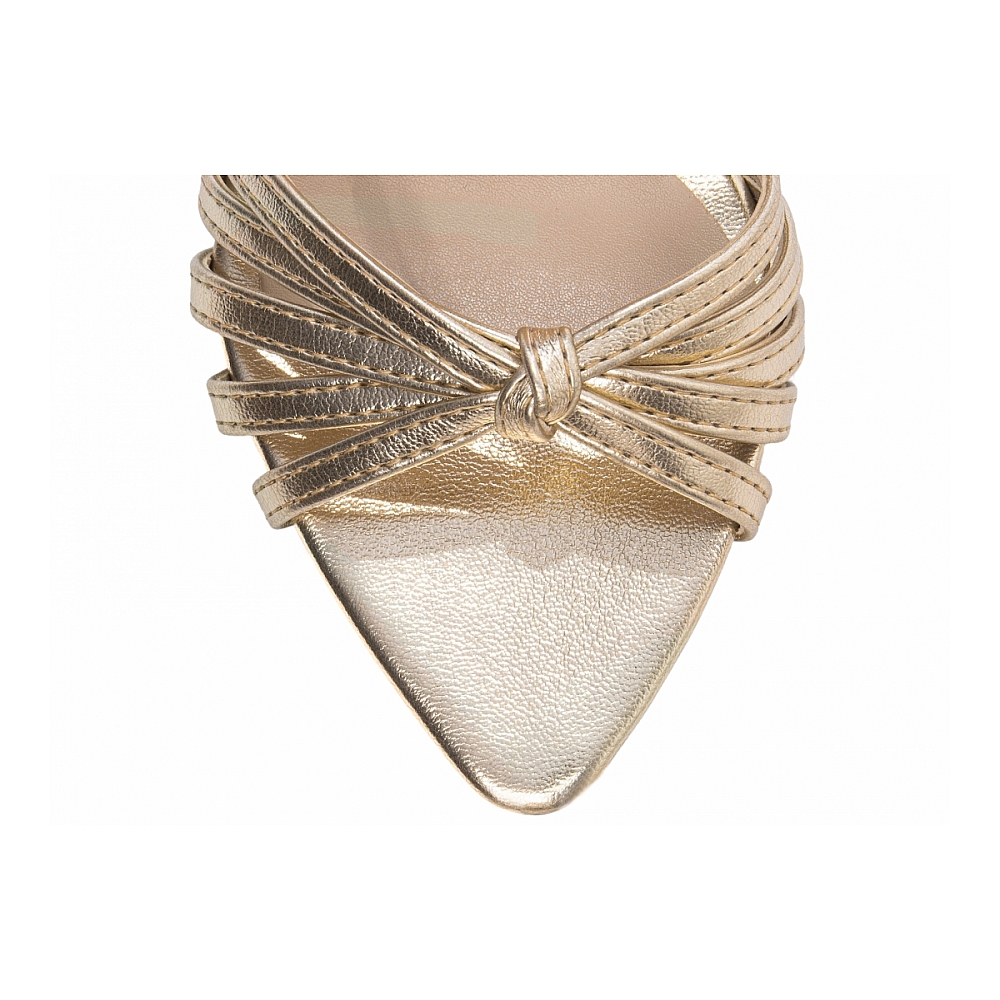 • Salto: Fino tipo agulha com 9 cm de altura, pintado em Dourado — imponência elegante com continuidade monocromática.