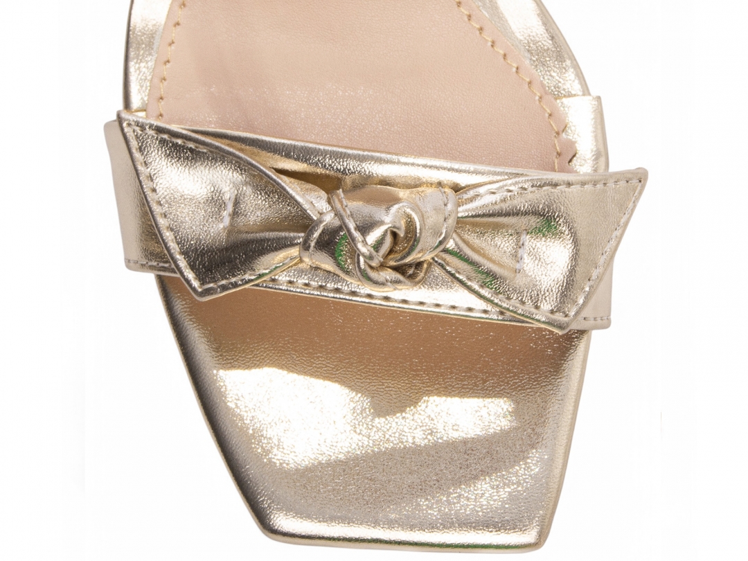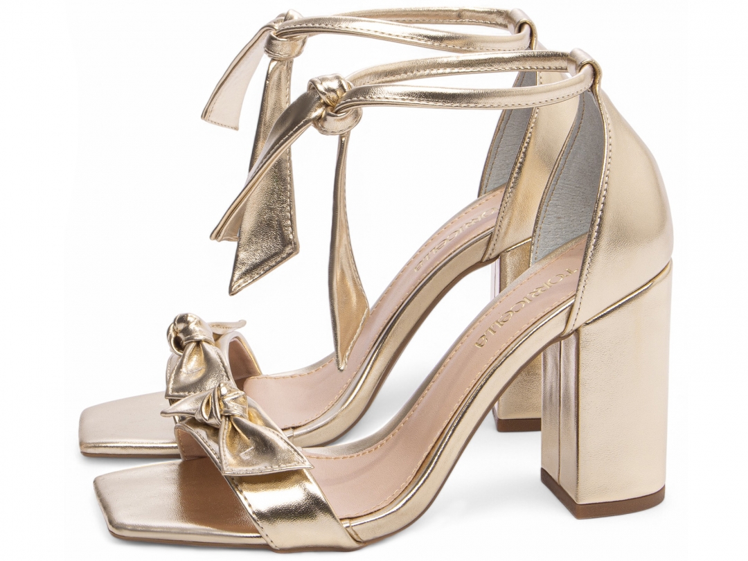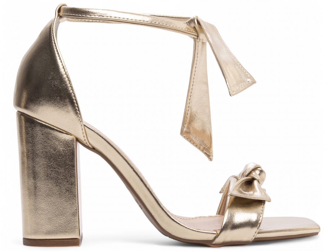 Sandália Feminina Dourada Salto Alto Grosso com Laço Duplo