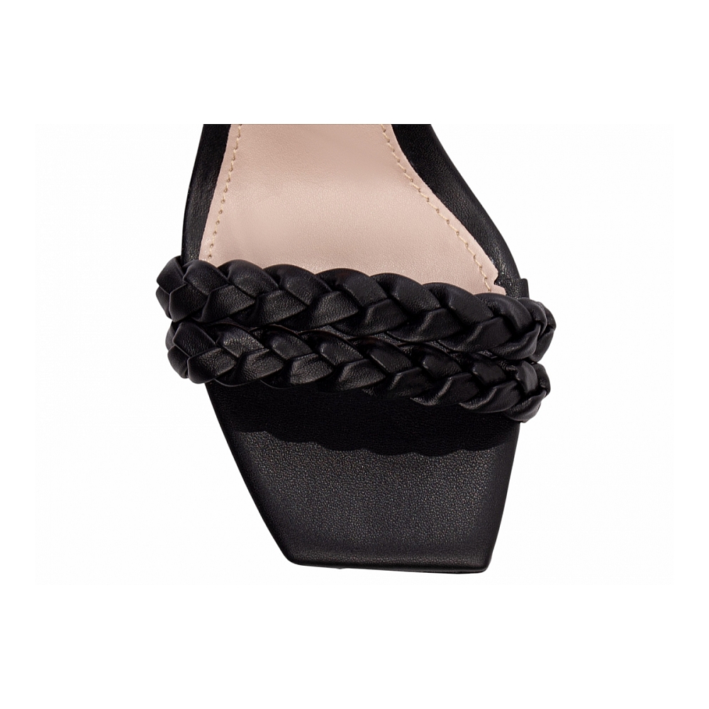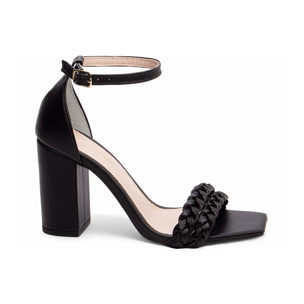 • Enfeite: Tiras trançadas em Napa Preto e fivela de metal dourado — detalhe elegante que valoriza o design com requinte.