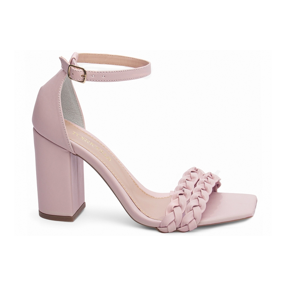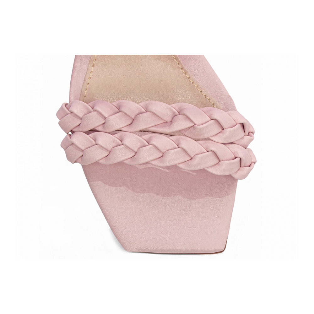 • Enfeite: Tiras trançadas em Napa Rosa e fivela de metal dourado — detalhe artesanal com toque sofisticado e visual encantador.