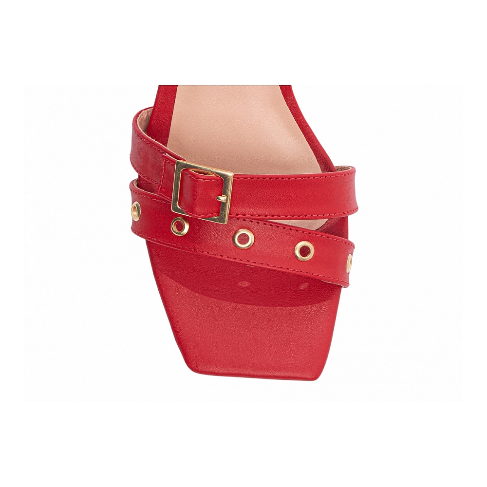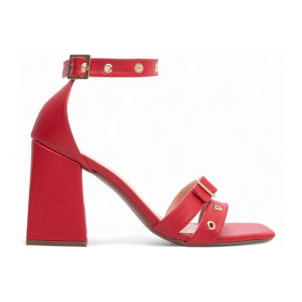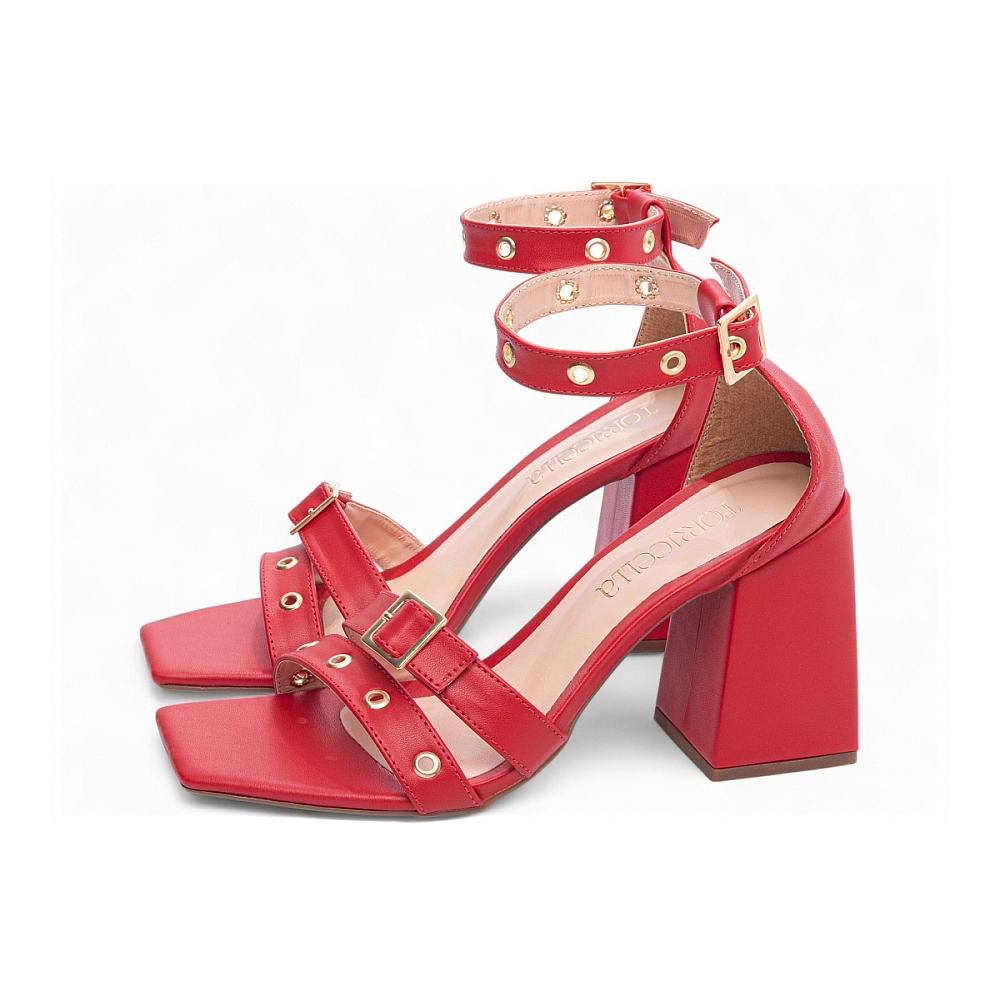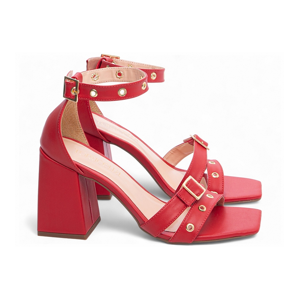 Sandália Feminina Vermelho de Salto Grosso Características: – Material: Napa Vermelho. – Enfeite: Ilhós na cor dourado e fivela de ajuste na cor dourado. – Palmilha: 8 mm de espessura, espuma em EVA revestida em Napa Vermelho e taloneira Napa Bege. – Salto: Grosso com 9 cm de altura, revestido em Napa Vermelho. – Solado: TR antiderrapante na cor bege. Cuidados com seu Scarpin: – Limpe com um pano macio e úmido, evitando produtos abrasivos. – Armazene em local seco e arejado, longe de exposição direta ao sol. – Utilize produtos específicos para conservação de napa e verniz.