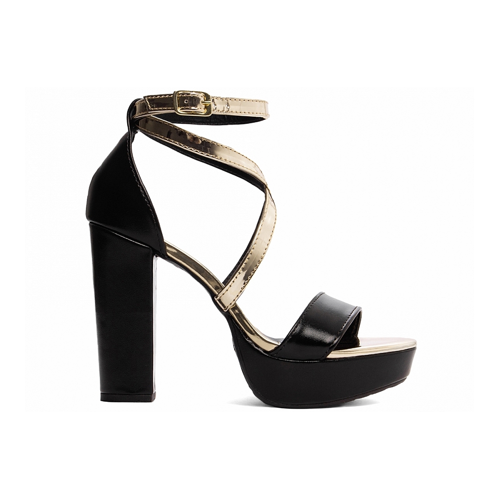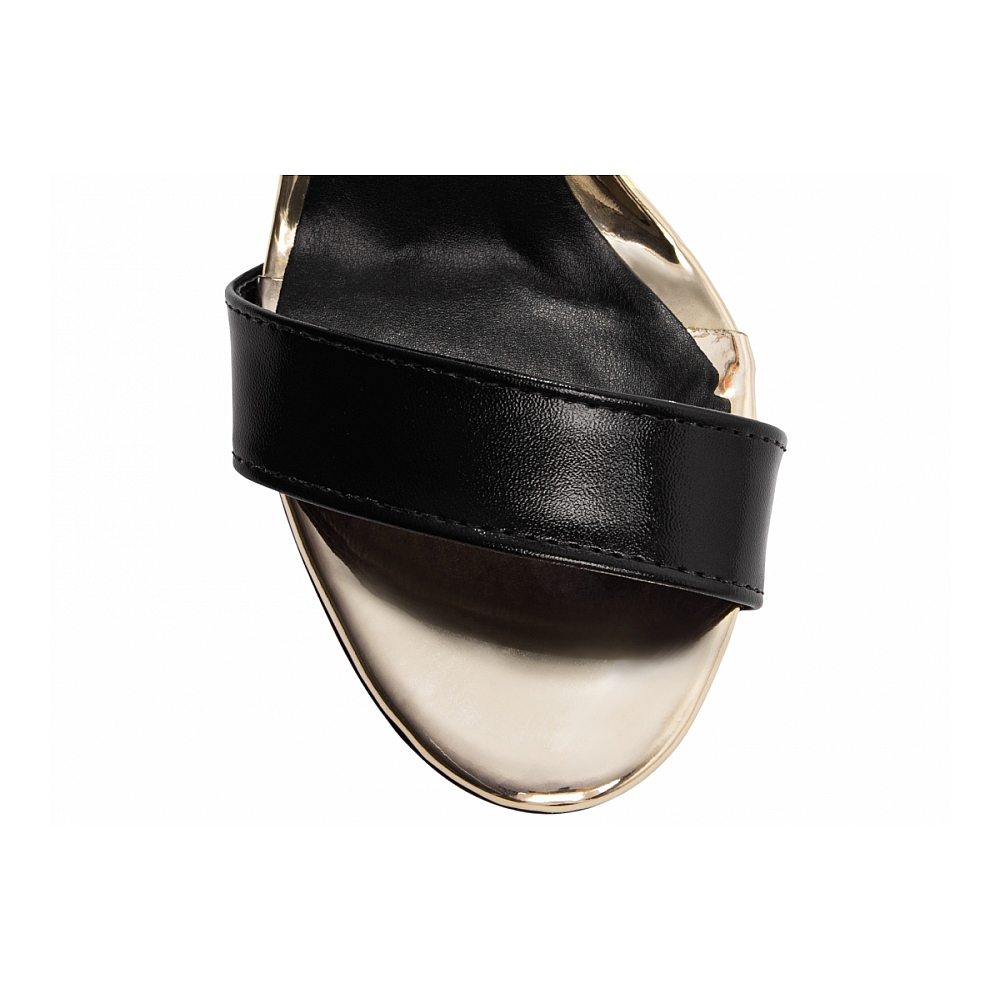 • Palmilha: Espuma em EVA com 8 mm de espessura, revestida em Verniz Metalizado Specchio Ouro Light com taloneira em Napa Preto — conforto anatômico aliado ao estilo sofisticado.