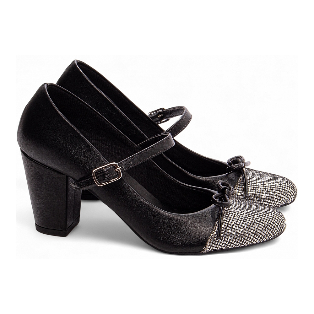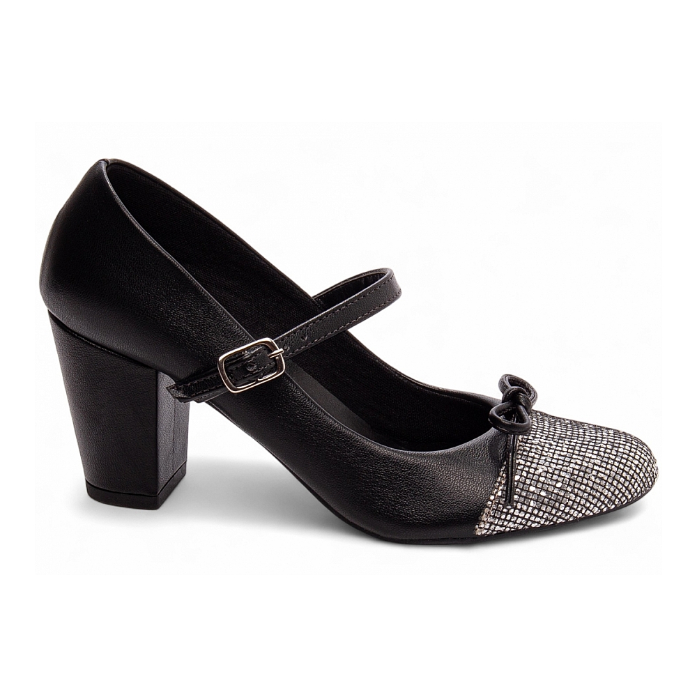 Mary Jane Preta com Salto Médio e Toques de Glitter Prata Características: – Material: Napa Preto com detalhes em Glitter Prata ? combinação clássica com um toque de brilho moderno – Enfeite: Laço delicado em Napa Preto e fivela ajustável na cor Prata, proporcionando charme e praticidade – Palmilha: Espuma em EVA com 8 mm de espessura e taloneira em Napa Preto ? conforto pensado para o dia todo – Forro: Cacharrel preto, material espumado que oferece suavidade e proteção térmica – Salto: Médio, com 7 cm de altura, encapado em Napa Preto, visual delicado com equilíbrio – Solado: PVC com antiderrapante na cor Preto, garantindo segurança e discrição no caminhar Dicas de Limpeza e Conservação: – Limpe suavemente com pano macio levemente umedecido em sabão neutro, evitando friccionar as áreas com glitter – Armazene em local seco e arejado, longe da luz solar direta; use saquinhos de tecido para preservar os acabamentos delicados – Para manter o brilho do glitter, utilize flanela seca com cuidado, sem esfregar, e evite contato com produtos abrasivos