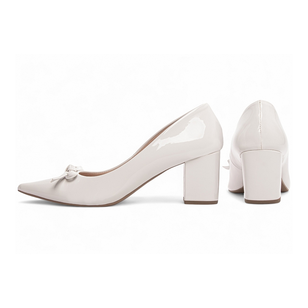 Scarpin Off White Salto Médio com Laço em Verniz Características: – Material: Verniz Off White com acabamento elegante e toque moderno – Enfeite: Laço na mesma cor e material, criando um visual monocromático delicado – Forro: Cacharrel bege ? tecido espumado que proporciona conforto macio e respirabilidade – Palmilha: 8 mm de espessura, com espuma em EVA e taloneira em Napa Bege, garantindo conforto ao longo do dia – Salto: Grosso com 6,5 cm de altura, revestido em Verniz Off White ? leveza e equilíbrio para produções versáteis – Solado: PVC com antiderrapante na cor Bege para maior segurança e estabilidade Dicas de Limpeza e Conservação: – Limpe com pano macio levemente umedecido com sabão neutro, evitando friccionar diretamente o verniz – Armazene em local seco e arejado, longe da luz solar direta; use saquinhos de tecido para evitar riscos e preservar o brilho – Finalize com flanela seca para manter o verniz reluzente e a aparência sempre impecável