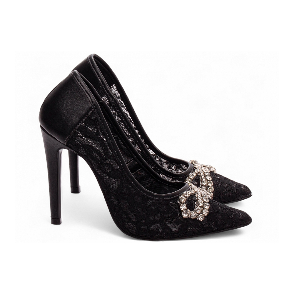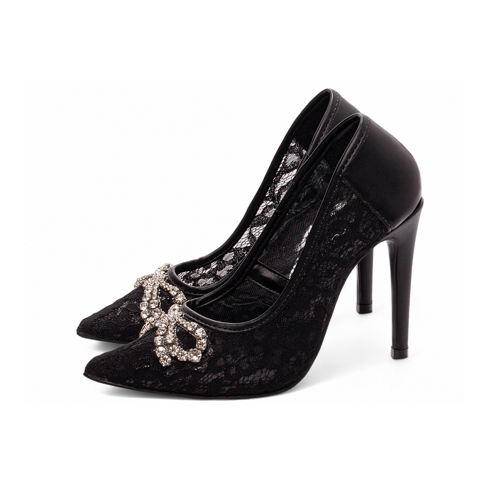 Scarpin Preto Salto 12 com Laço em Strass e Transparência Elegante