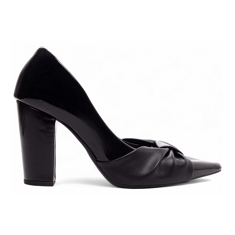 Scarpin Preto Salto Grosso com Laços Elegantes Características: – Material: Verniz Preto e Napa Preto – Enfeite: Tiras em laço nas cores Verniz Preto e Napa Preto, criando um contraste de texturas refinado – Forro: Cacharrel preto ? tecido espumado que oferece toque macio e conforto prolongado – Palmilha: 8 mm de espessura, com espuma em EVA e taloneira em Napa Preto – Salto: Grosso com 9 cm de altura, encapado em Verniz Preto para um visual sofisticado e seguro – Solado: PVC com antiderrapante na cor Preto Dicas de Limpeza e Conservação: – Limpe cuidadosamente com pano macio e levemente umedecido em sabão neutro ? evite o atrito nas áreas envernizadas para manter o brilho. – Guarde o scarpin em local seco, arejado e longe da luz solar direta; saquinhos de tecido ajudam a conservar tanto o verniz quanto a napa. – Utilize hidratante específico para napa sintética e flanela seca para polir o acabamento brilhante com delicadeza.
